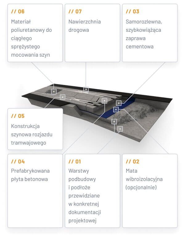 Oszczędność czasu jest często decydującym argumentem przy wyborze technologii, zwłaszcza jeśli dotyczy prac budowalnych prowadzonych w centrach miast i związanych z nimi utrudnień. Przenosząc znaczną ilość procesów z placu budowy do fabryki producenta, wydatnie skracamy czas zabudowy kluczowych elementów infrastruktury torowej. Zamiast kilku tygodni koniecznych m.in. do dojrzewania warstw betonu, potrzebujemy kilku dni, by zabudować rozjazd czy przejazd i zintegrować go z nawierzchnią drogową (pasy autobusowo-tramwajowe, ronda, skrzyżowania drogowo-kolejowe, terminale przeładunkowe, przejścia dla pieszych czy przejazdy rowerowe). Ważnym aspektem jest też fakt skrócenia prac potrzebnych przy wymianie części stalowej rozjazdu. Możliwość wyciągnięcia zużytej konstrukcji stalowej, bez naruszenia płyty żelbetowej, a następnie szybkiego ułożenia nowego rozjazdu w kanałach szynowych, daje olbrzymią przewagę naszej technologii.