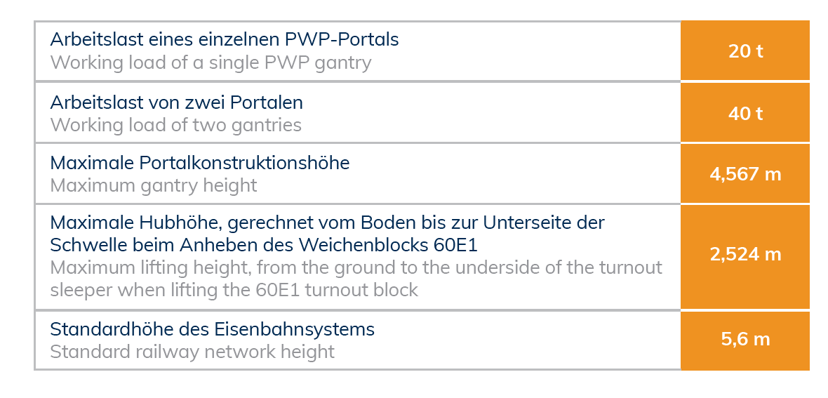 Diese Phase umfasst die sichere Anlieferung kompletter Module zur Baustelle – einschließlich übergroßer Elemente – sowie deren präzise Positionierung an der für den Einbau vorbereiteten Stelle. Bei punktuellen Austauscharbeiten an bestimmten Infrastrukturelementen (Weichen oder Übergängen) ist es wichtig, dass die Fertigteile unter den aufgehängten Oberleitungen nur bei ausgeschalteter Spannung verlegt werden können (Dies spart zusätzliche Zeit und Kosten). Unter solchen Bedingungen bewähren sich die PWP-Portalkräne besonders. Sie können in den Einbaubereich einfahren und das Fertigteil sicher und äußerst präzise positionieren.